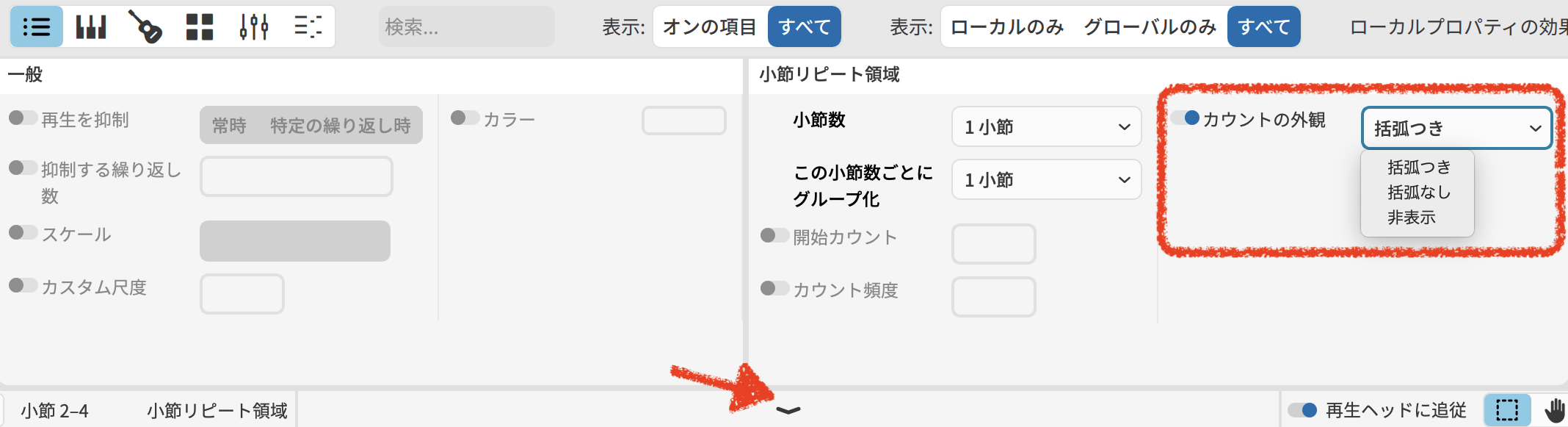 小節リピートの領域:「カウントの外観」で表示法や非表示の設定ができます。