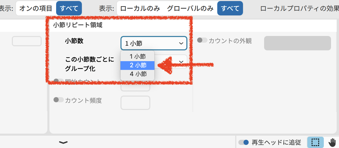 もし1小節リピートになってしまった場合は、画面下のプロパティパネルを開き、小節リピートの領域にある「小節数」を2小節に設定します。