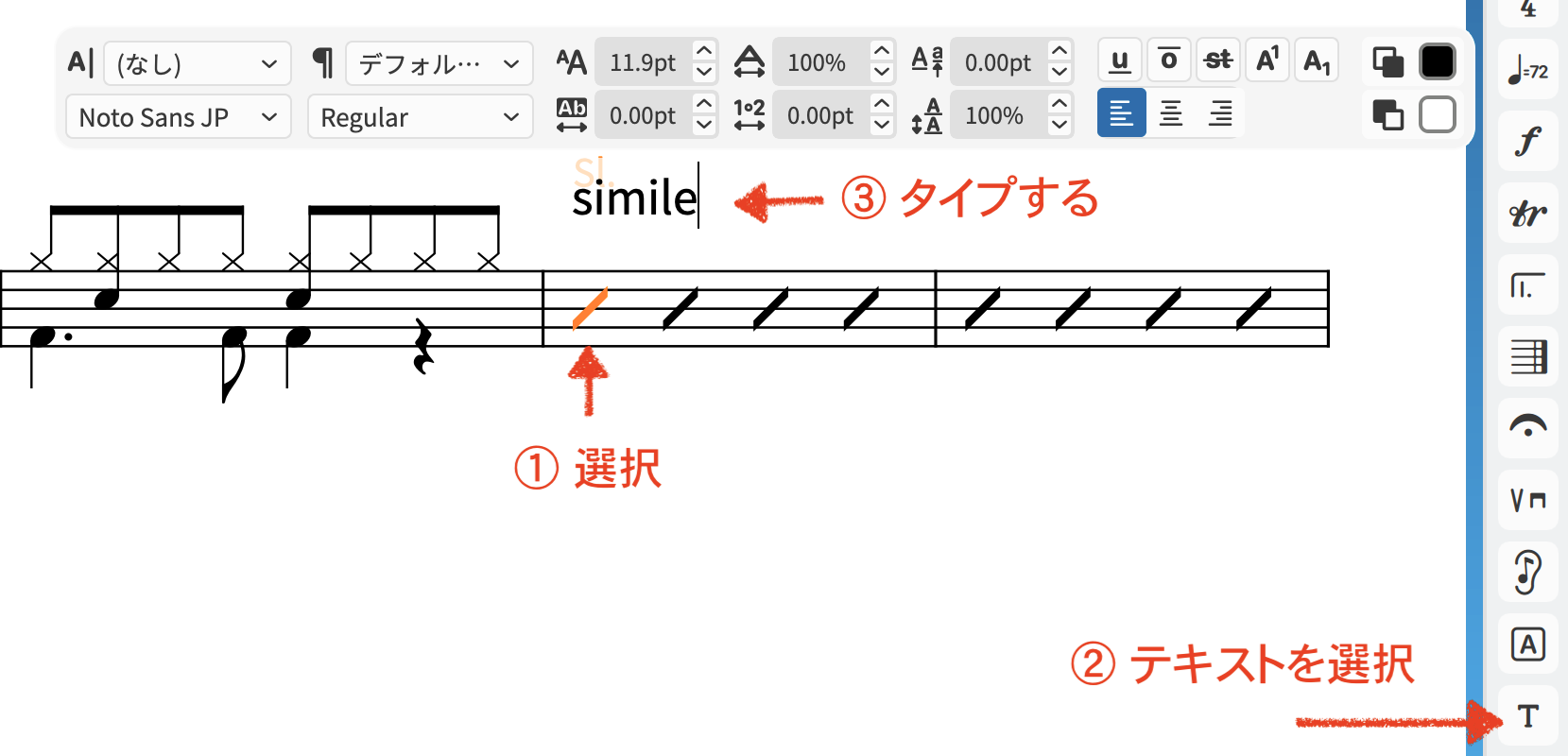 ② 記譜記号ツールボックス「テキスト」を選択します。