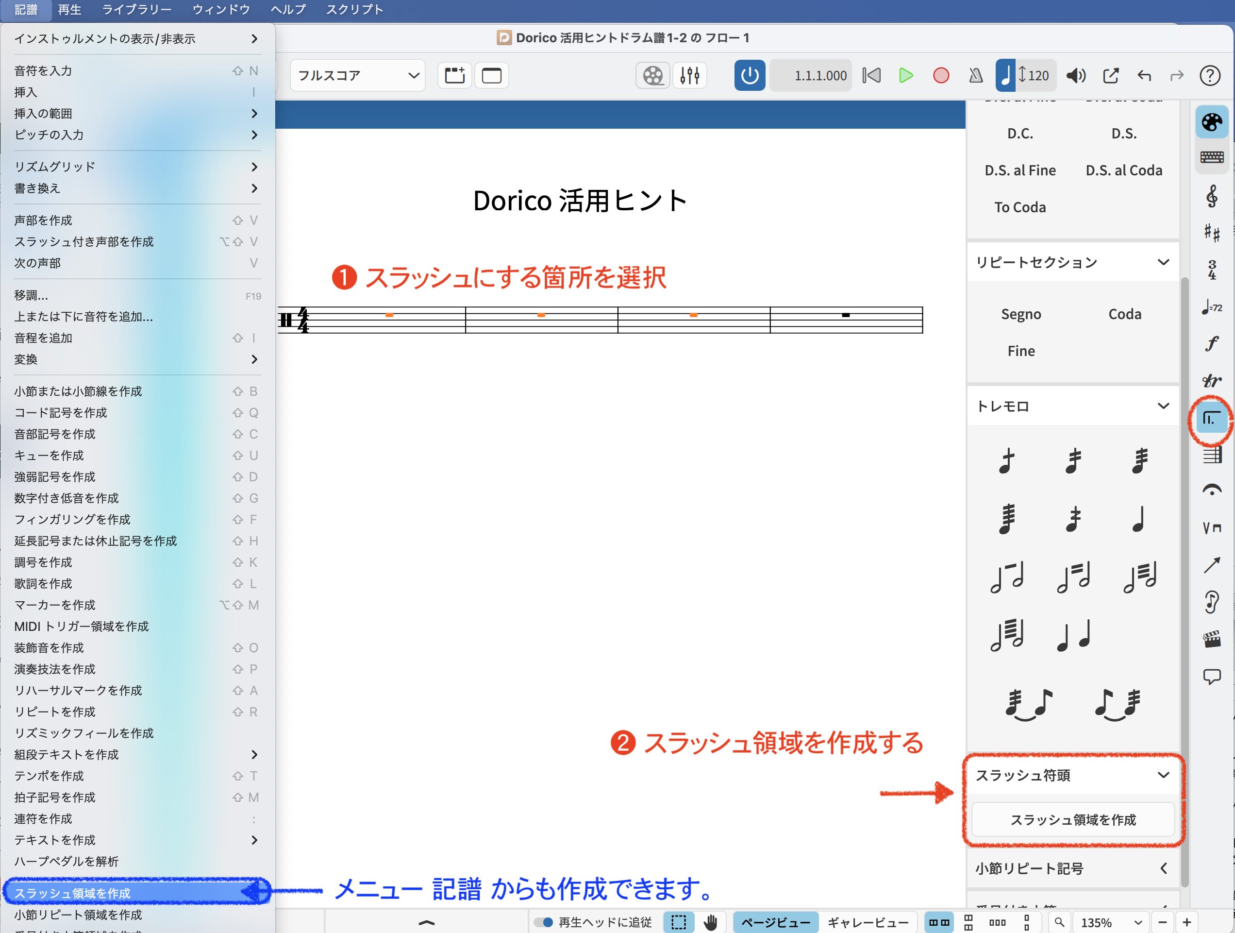 または、メニューの「記譜」→「スラッシュ符頭」→「スラッシュ領域を作成」を選択します。