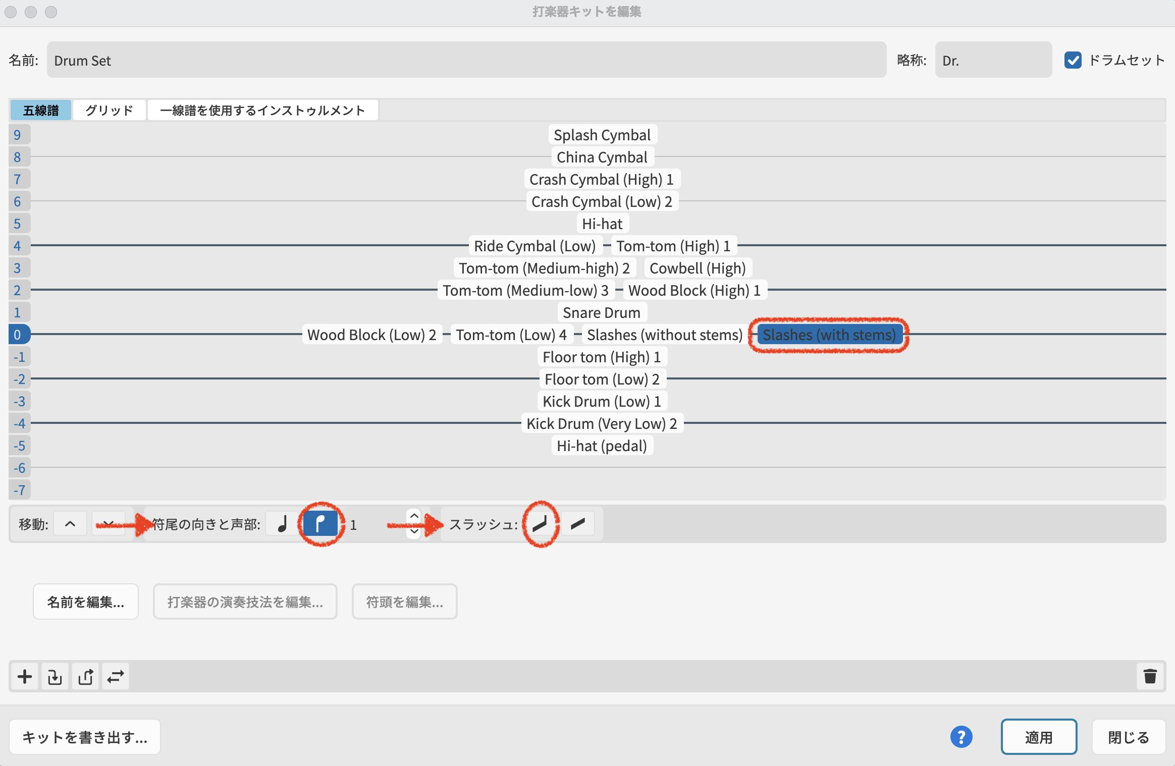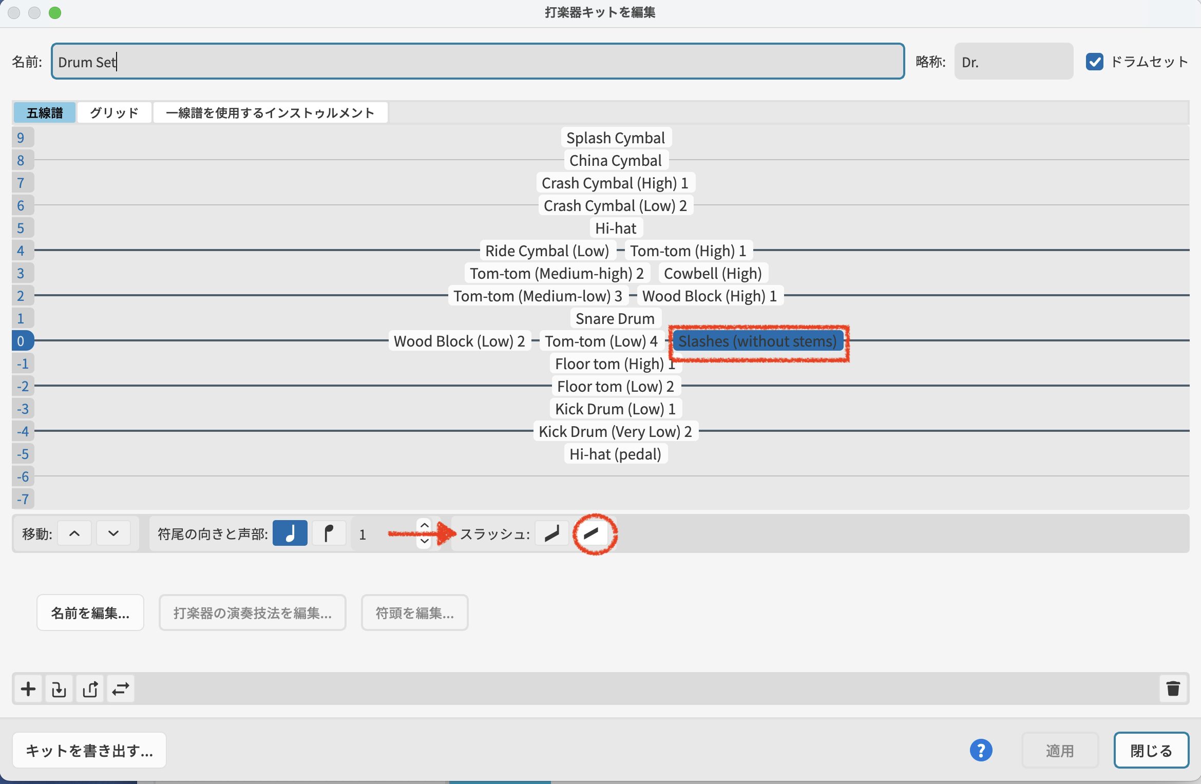 補足:符頭付きスラッシュを表示したい位置の音と符尾の向きのドラムパーツを選択します。