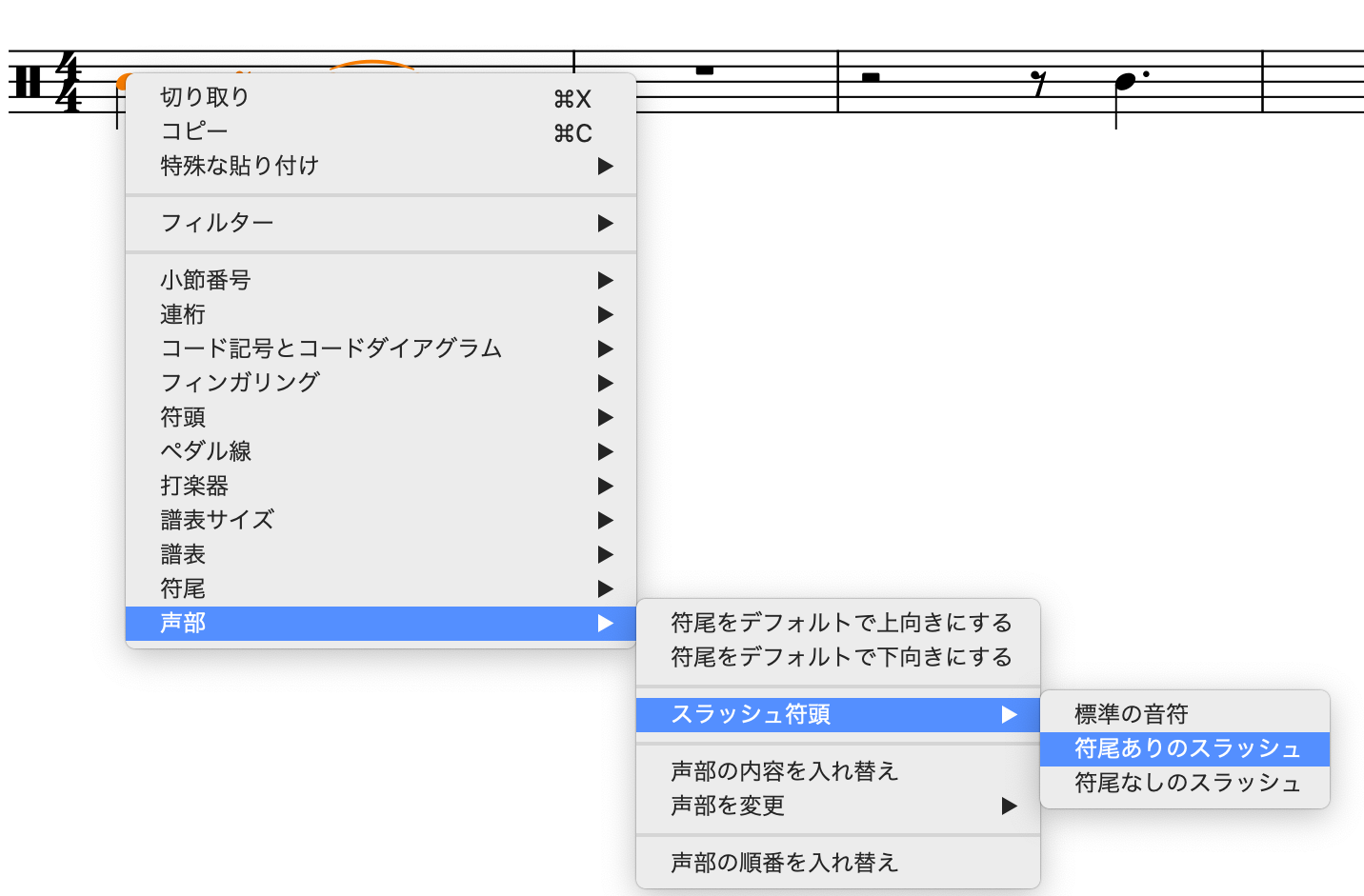 ② 音符を選択し、右クリック → 「声部」→「スラッシュ符頭」→「符尾ありのスラッシュ」を選択。