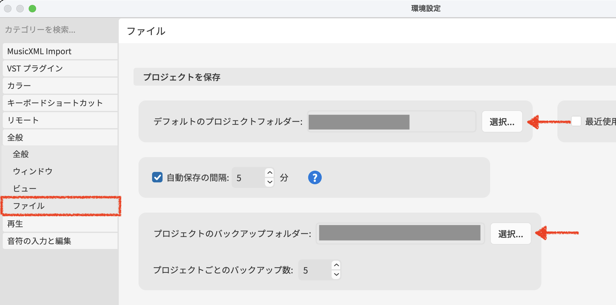 ① Dorico を開いて、環境設定【Command + ,】を開き、「全般」→「ファイル」を選択します。