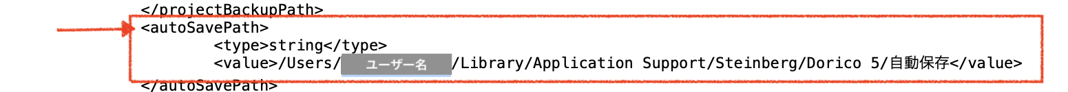 - <autoSavePath> の下方にある <value>/Users/新しいユーザー名/Library/~ に書き換えます