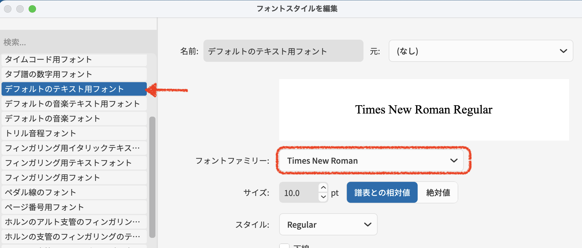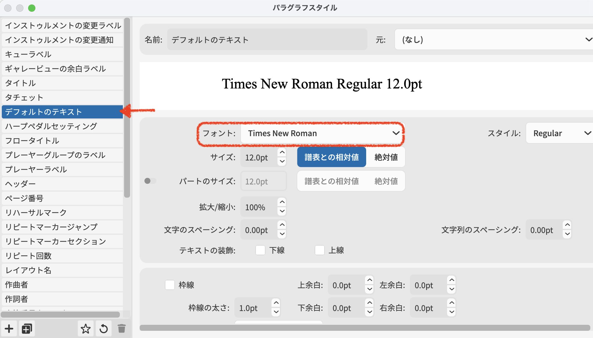 - パラグラフスタイル:タイトルや作曲者のような楽曲情報や歌詞やリハーサルマークなどのフォントが変更ができます。