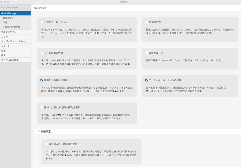 Finaleで浄書したものを崩したくない項目にチェックを入れてます。詳細設定についてはデフォルトの「シングルプレイヤーに結合」にチェックを入れてます。