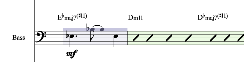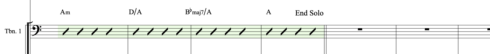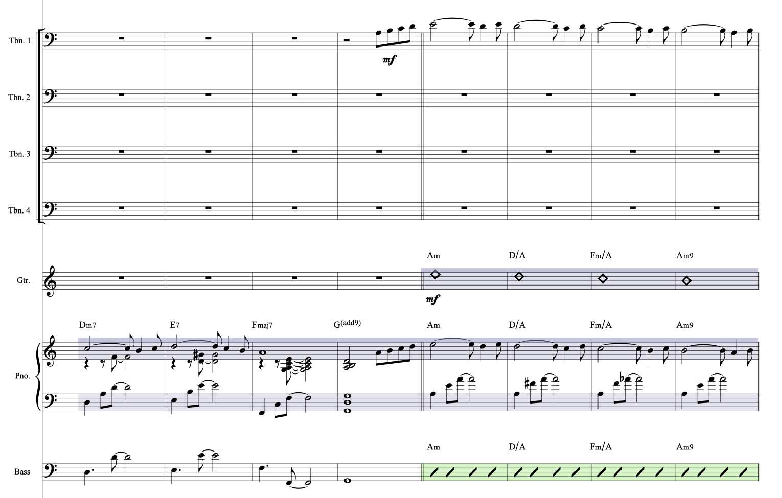 リズムセクションは常にコードを表示するアレンジの場合は、ここで完了です。もちろんパート譜にも適用されています!