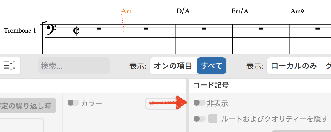 これで必要なところにのみコードを表示できます。もちろんパート譜にも適用されます!