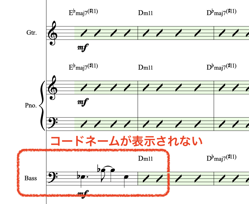 3. スラッシュ領域にはコードネームが表示されますが、音符の部分には非表示になります。