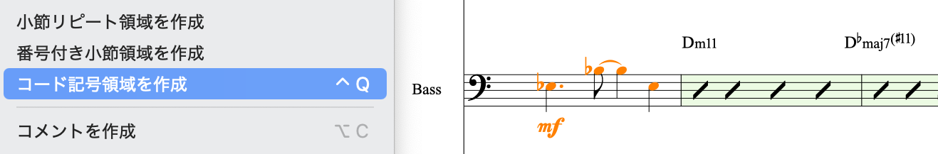 リズムセクションなどで、コードネームを部分的に表示・非表示にする場合は、コード記号領域を作成します。