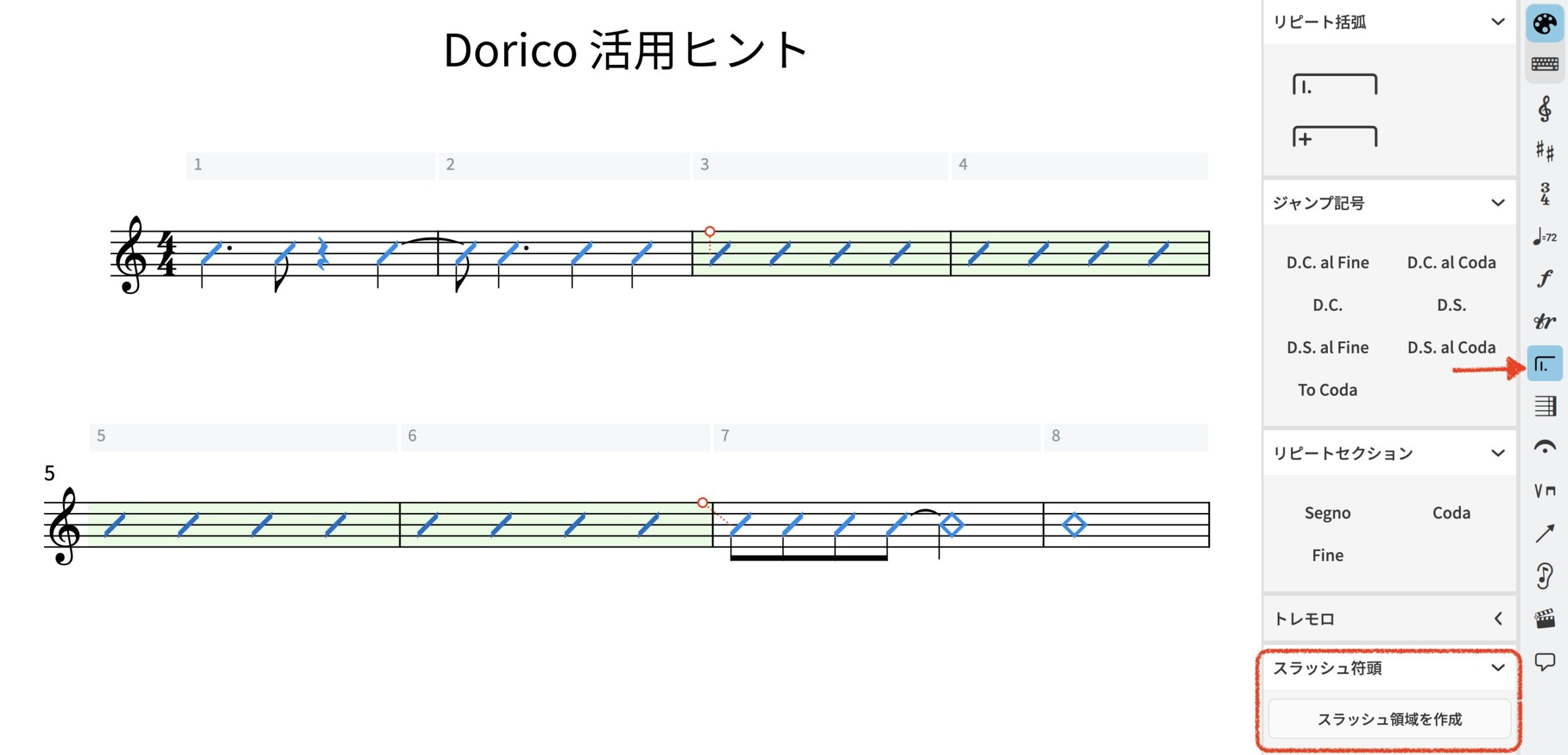 ③ スラッシュにしたい箇所を選び、右端の記譜記号ツールボックスの「反復記号」から「スラッシュ領域を作成」を選択します。