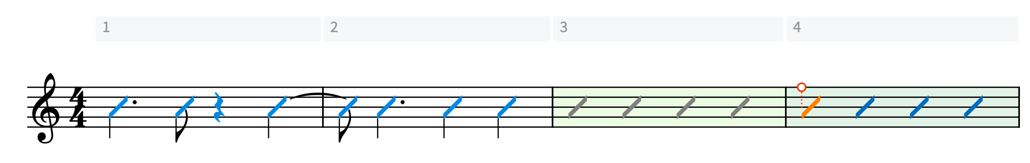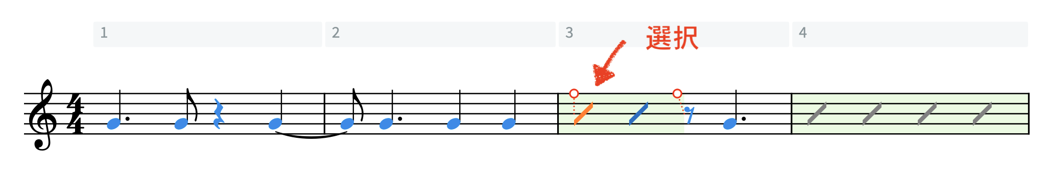 2. 例えば、3小節目の3〜4拍目をリズムスラッシュにしたい場合、4小節目の最初のスラッシュを選択し、ショートカット【U】でスラッシュを分割します。