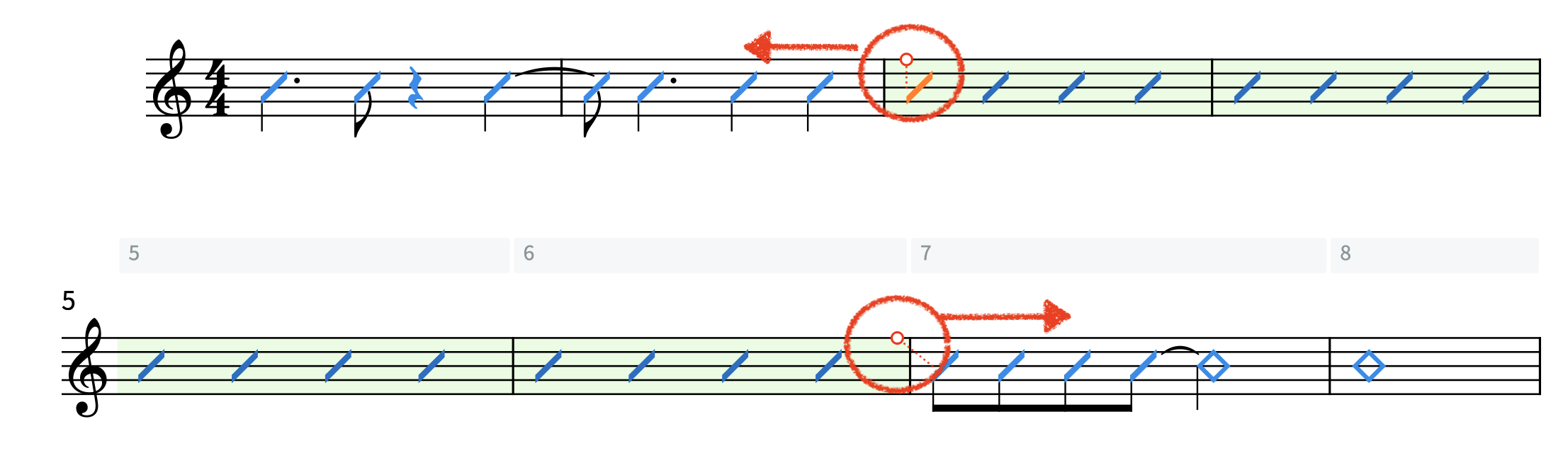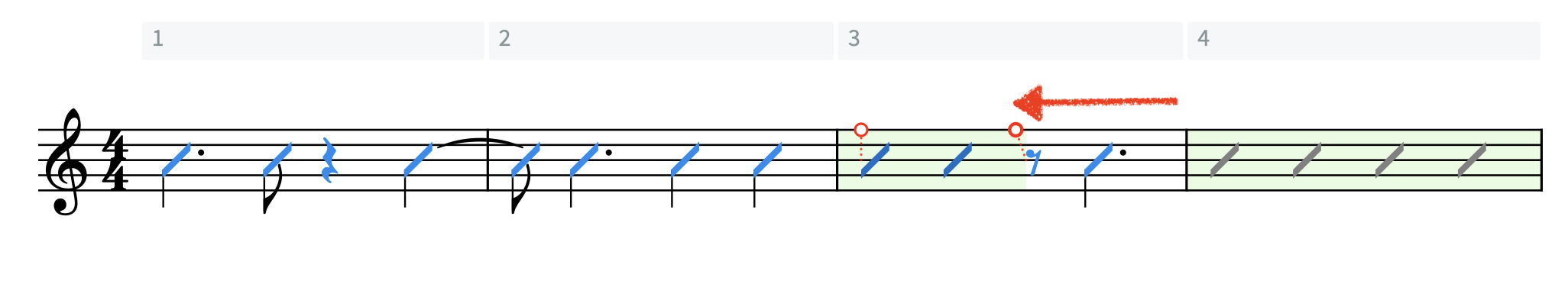 3. 小さな赤丸をクリック&ドラッグして、3小節目の3拍目まで伸ばすと、符頭付きスラッシュが表示されます。(始めに入力した音符(リズム)が表示されます。)