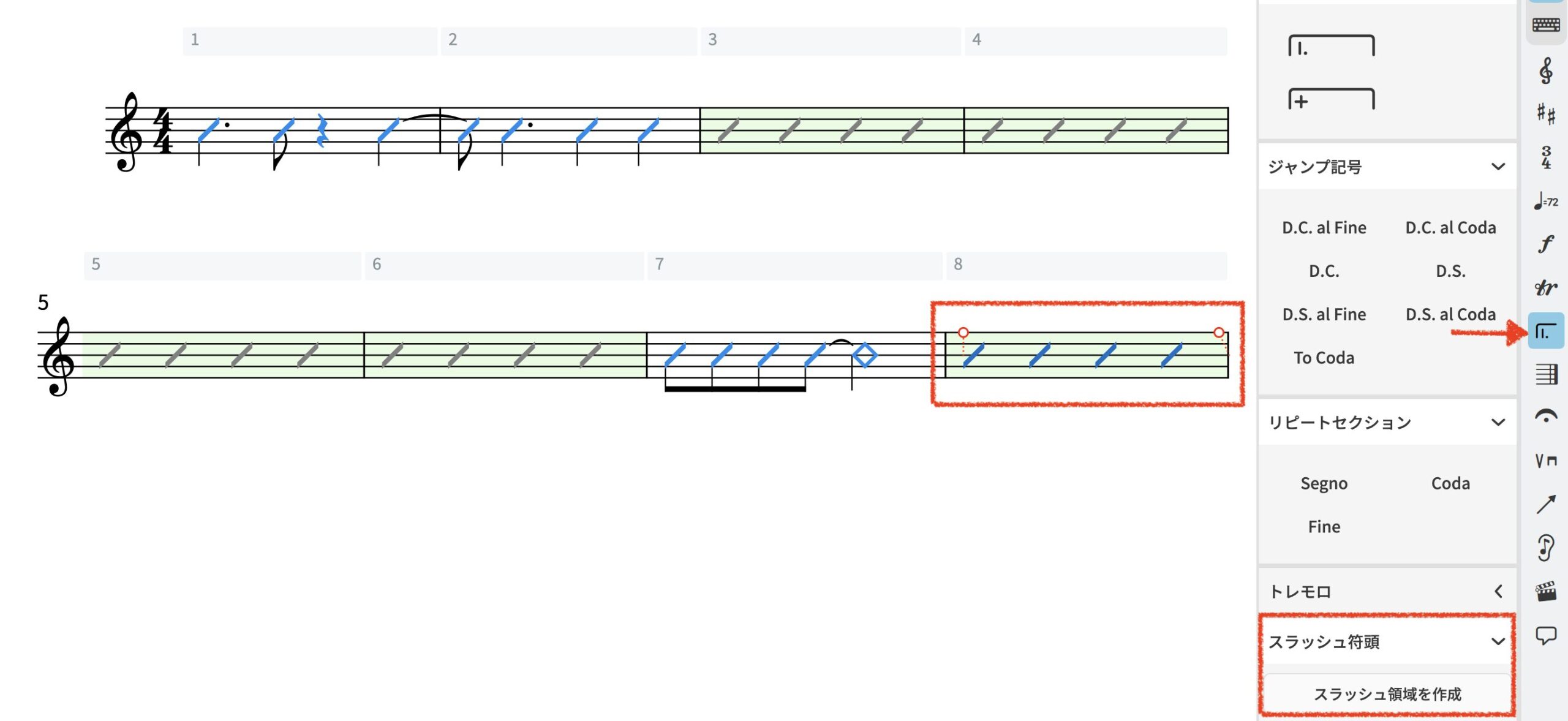 スラッシュを作成するには、スラッシュにしたい箇所を選択し、右側の記譜記号ツールボックスの反復記号から「スラッシュ領域を作成」を選択します。