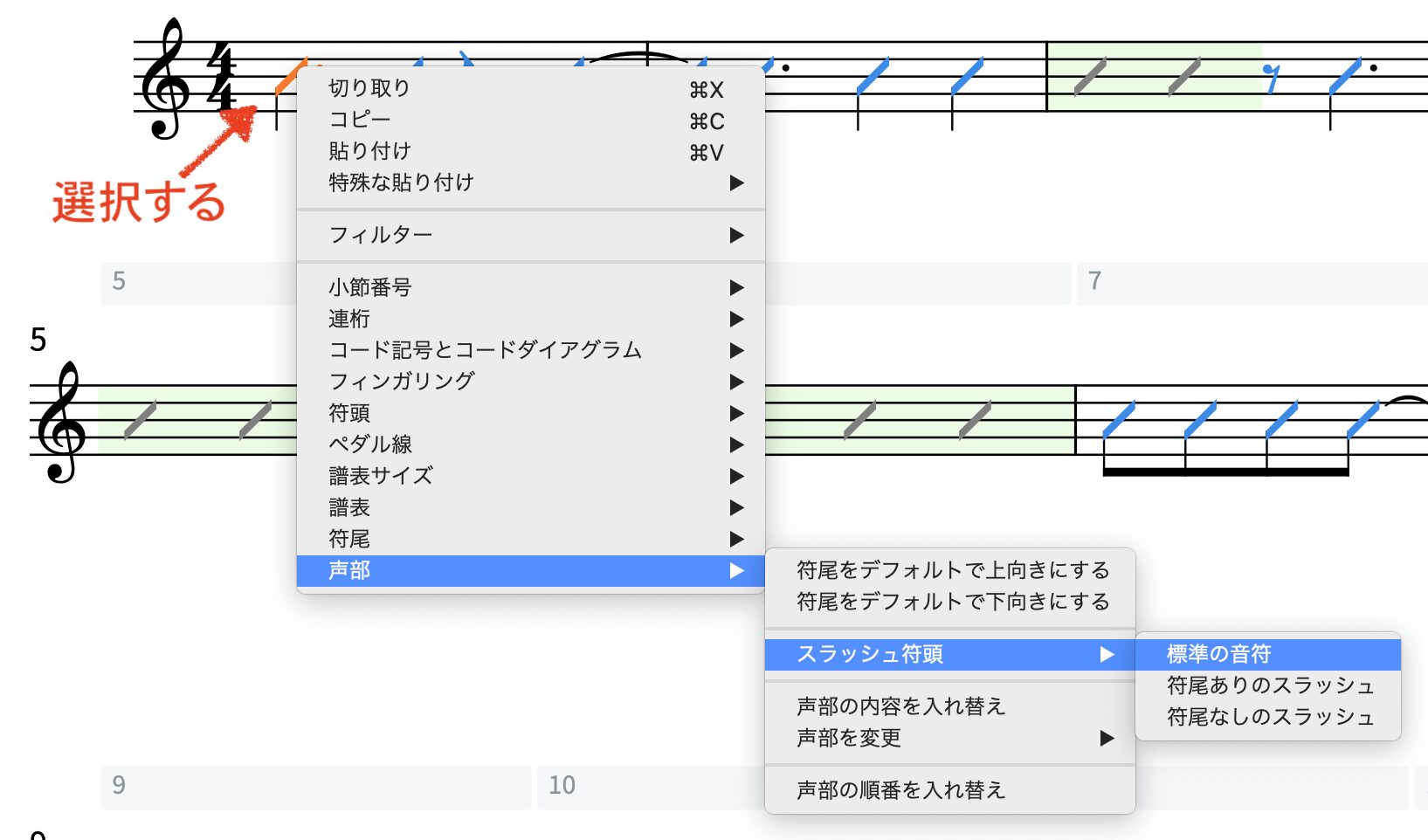 - 右クリック→ 声部 → スラッシュ符頭 → 標準の音符