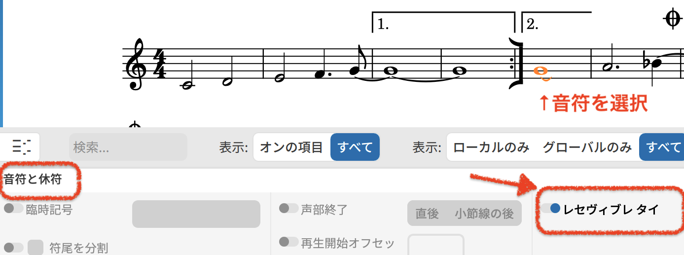2. プロパティパネルを開き、「音符と休符」からレセヴィブレタイをオンにする