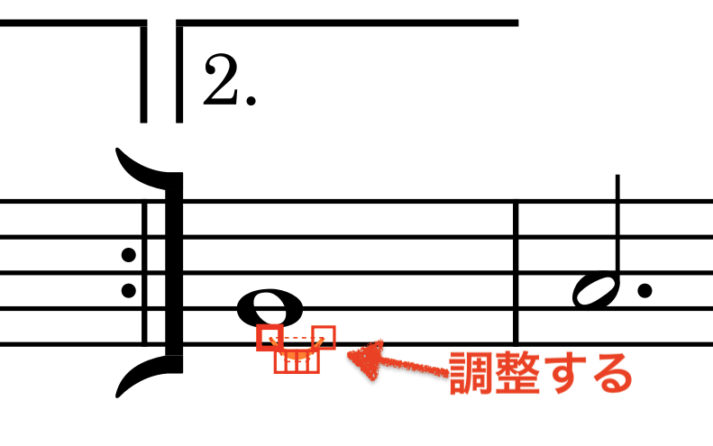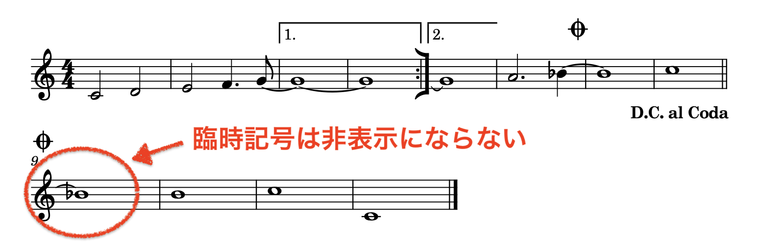 臨時記号がついた音符では、臨時記号がそのまま表示されてしまうため、手動で非表示にする必要があります。