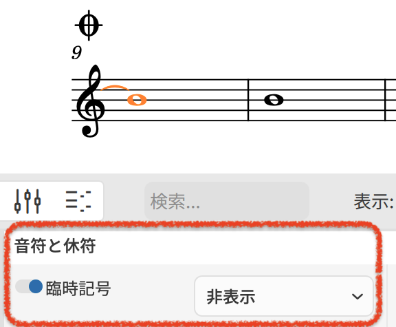 2. プロパティパネルを開き、「音符と休符」から臨時記号を非表示にする