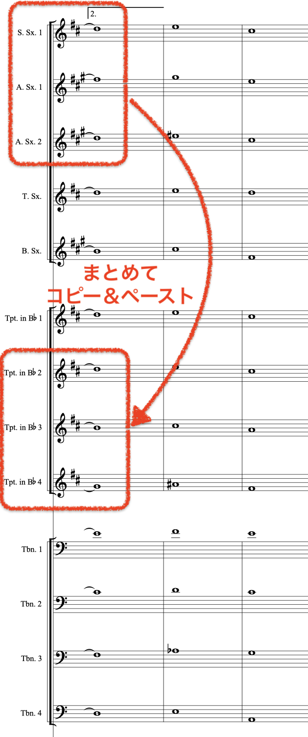 例えば、S.Sax、A.Sax1、A.Sax2 と、Tpt.2、Tpt.3、Tpt.4 は同じ音なのでまとめてコピーする。(下記はトランスポーズド・スコアです。)