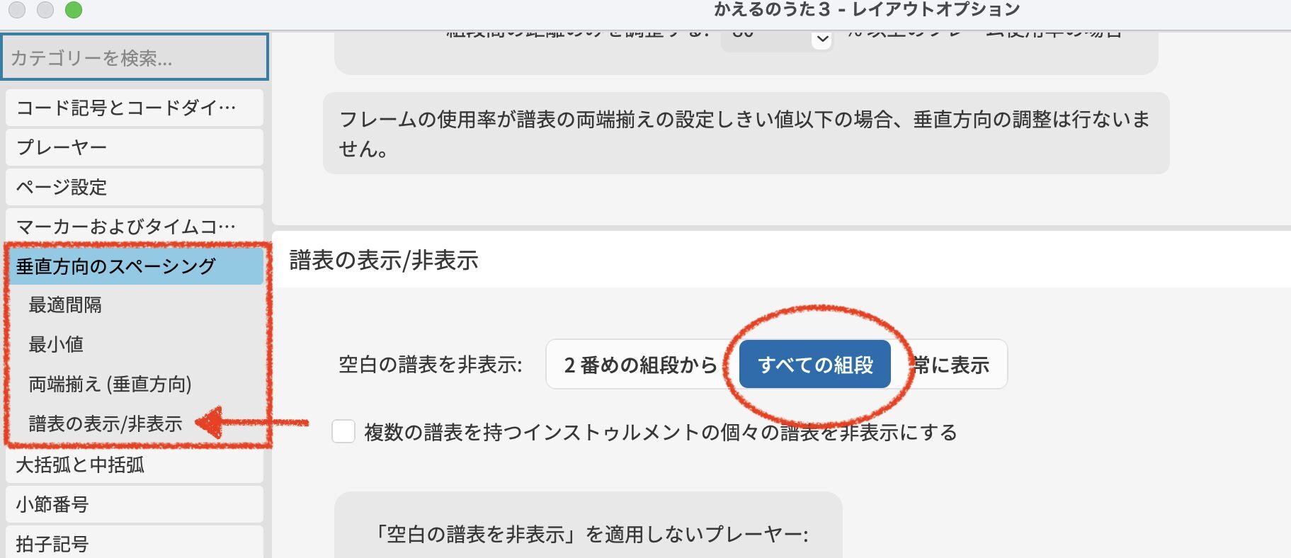 - レイアウトオプション:ショートカット【Mac: command + shift + L】【Win: Ctrl + shift + L】→『垂直方向のスペーシング』→譜表の表示/非表示で設定します。