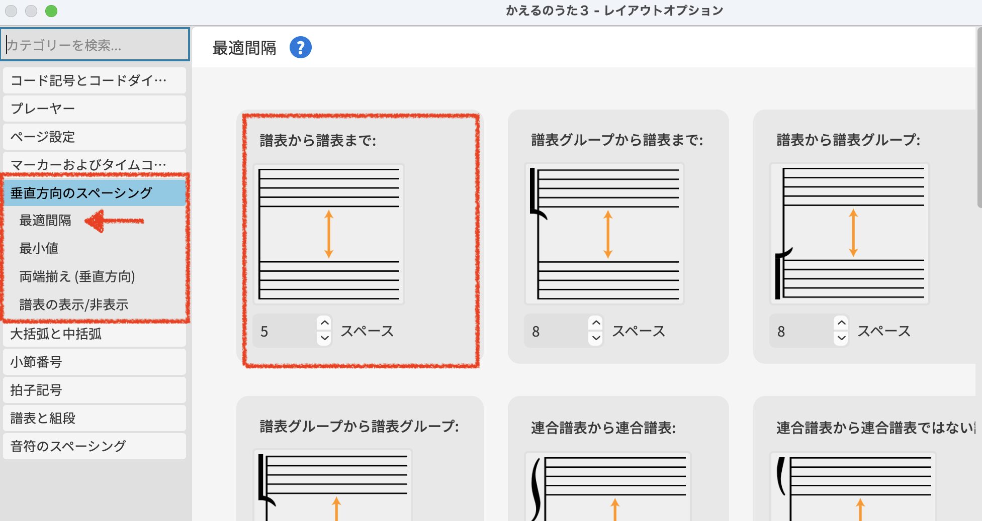 - 「垂直方向のスペーシング」から、最適間隔:譜表から譜表まで:ここで調整できます。