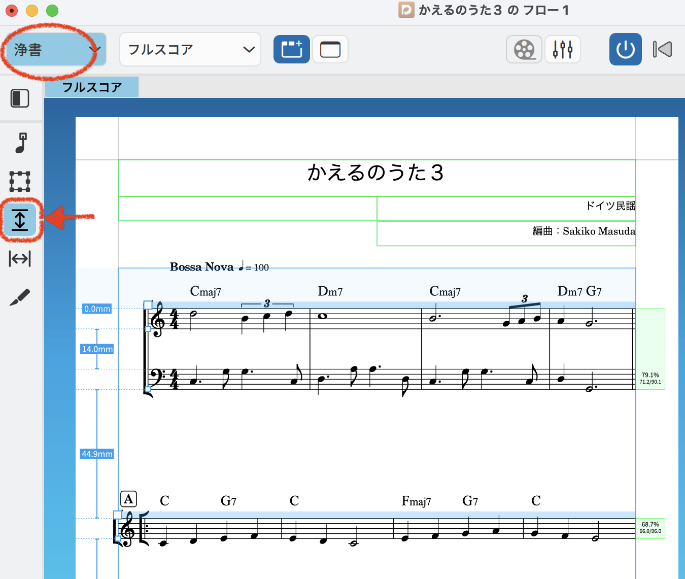 組段が少なく、楽曲フレームに空白部分が多いと、組段と組段の間隔が開いてしまうようなので、楽曲フレームを調整して、組段と組段の間隔を調整します。