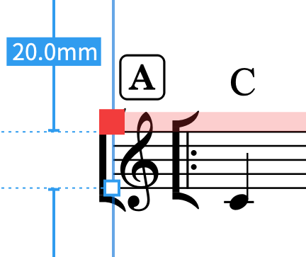 間隔が変更された組段とその組段の5線の左上のボックスが赤い表示になります。