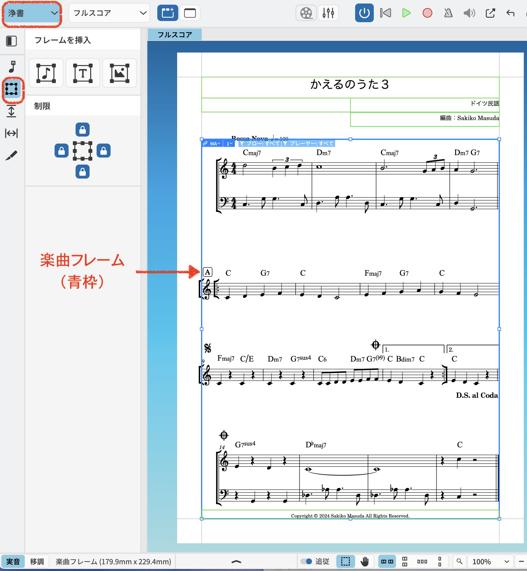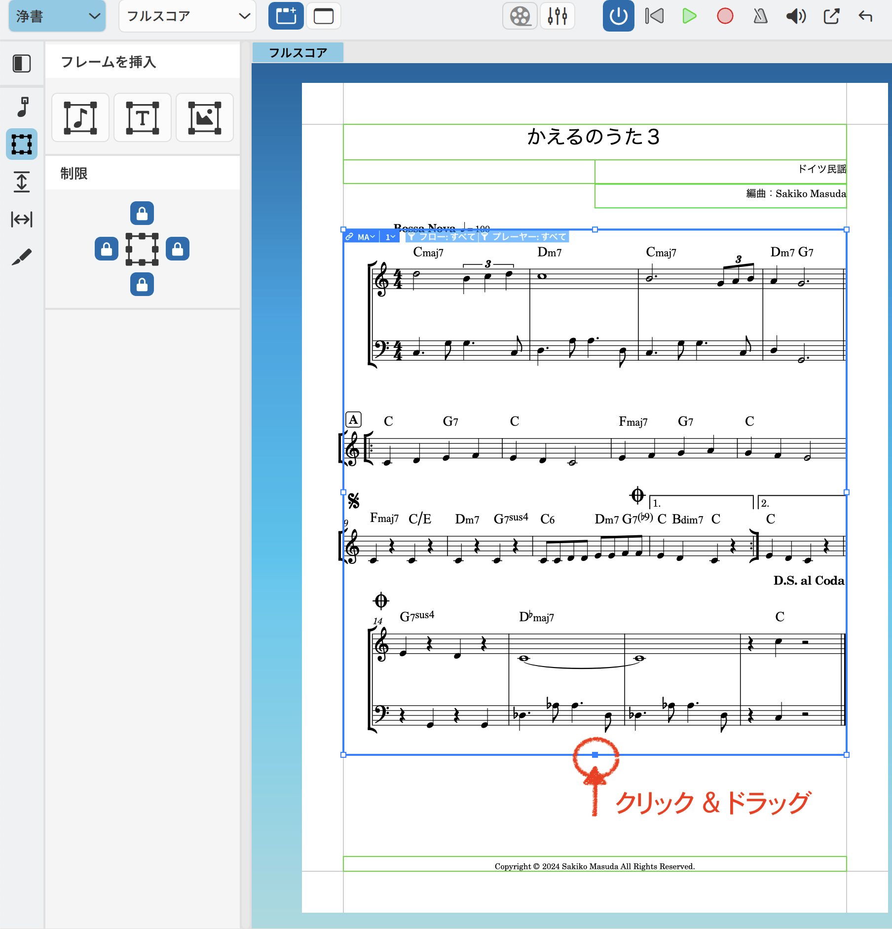 - 浄書モードの浄書ツールボックスから「フレーム」→楽曲フレーム(青枠線)の青いボックスをクリック&ドラッグで