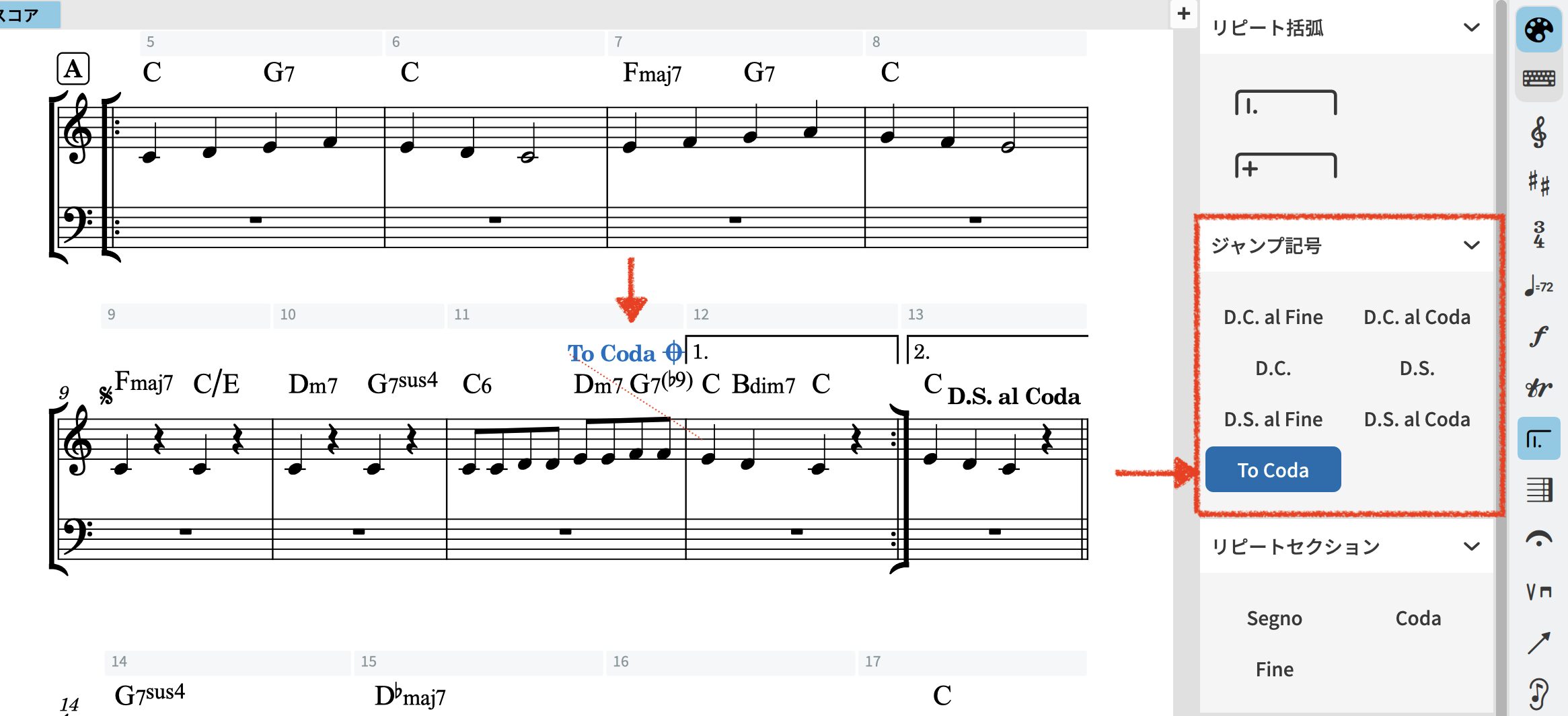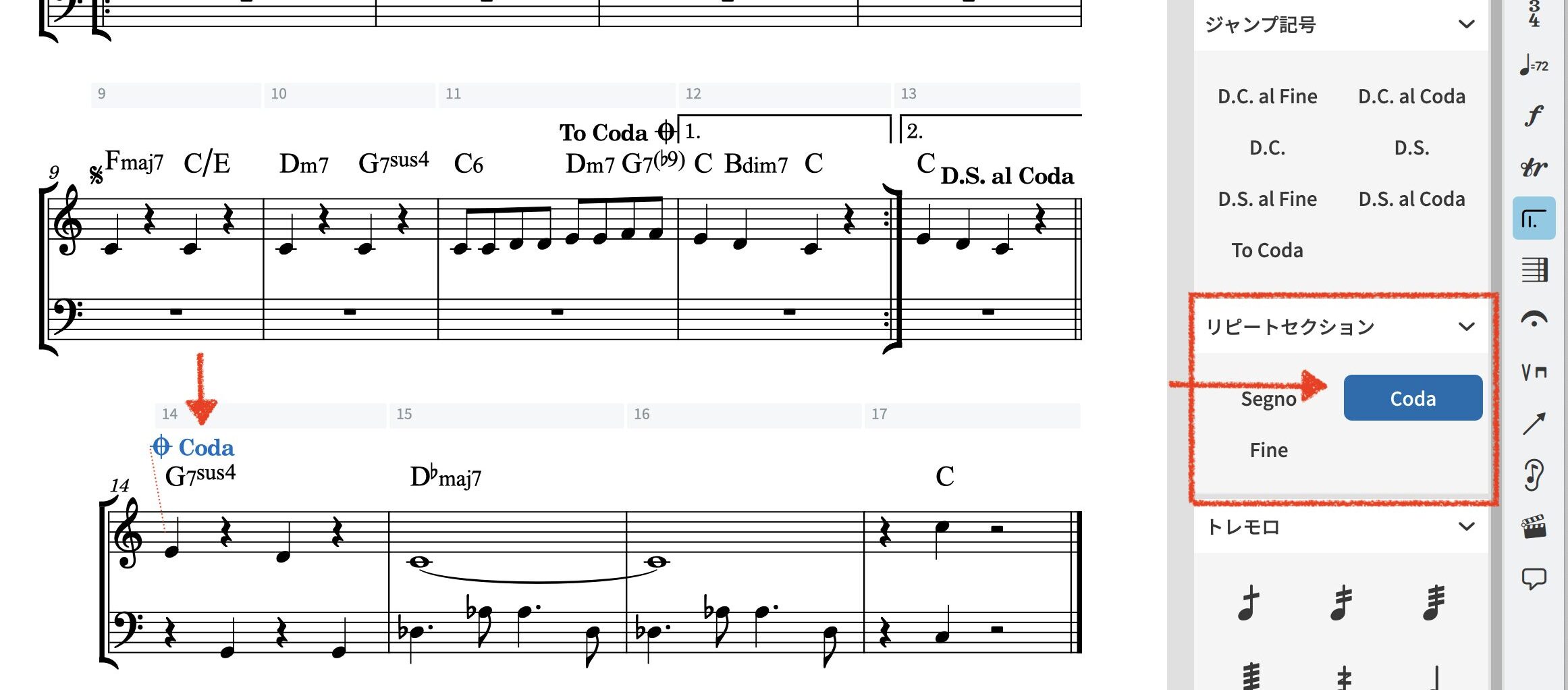 例4:14小節目のはじめにコーダ(リピートセクションから選びます)