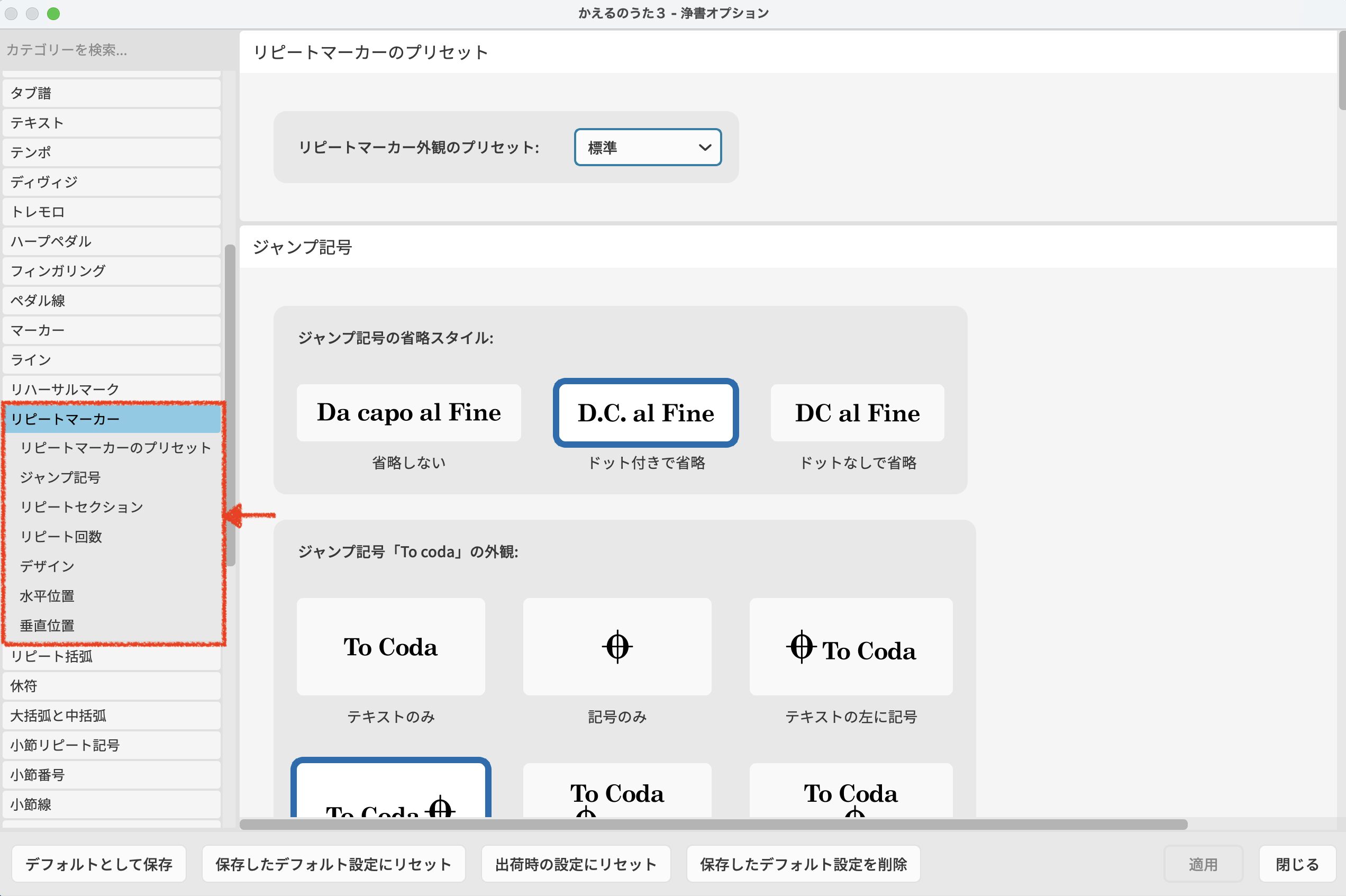 4. Coda の組段の開始位置を左揃えにしたい場合は、同じく浄書オプションの『リピートマーカー』から