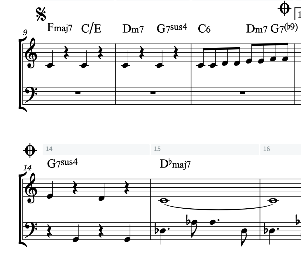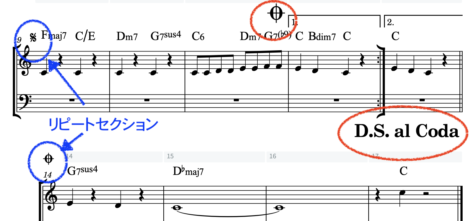 - 1番括弧の手前(11小節目の終わり)から14小節目へ進むコーダ