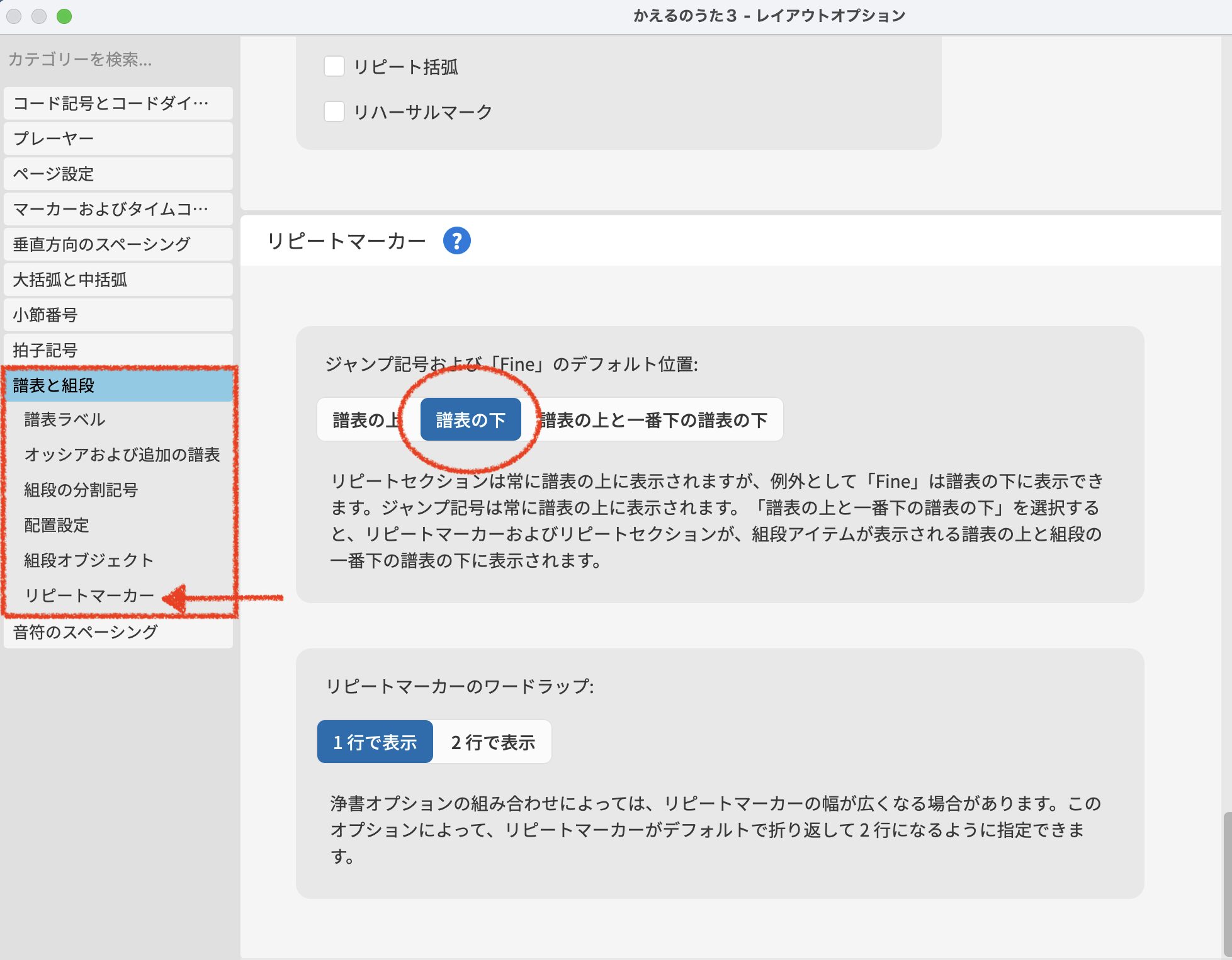 リピート記号の配置は、浄書オプションの『リピートマーカー』で設定できます。