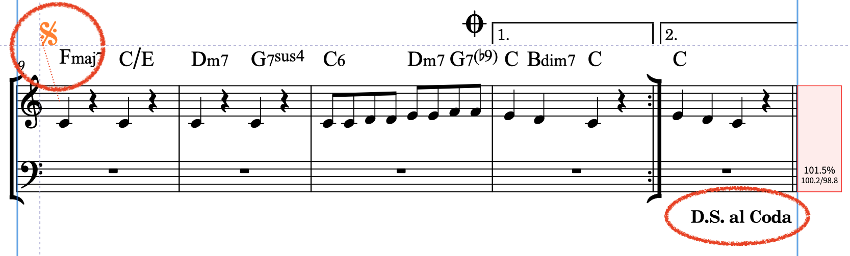 このように、リピートマーカーのジャンプのサイズを変更すると、D.C. や D.S. だけでなく、コーダ(ジャンプ記号)も同様に変更されます。