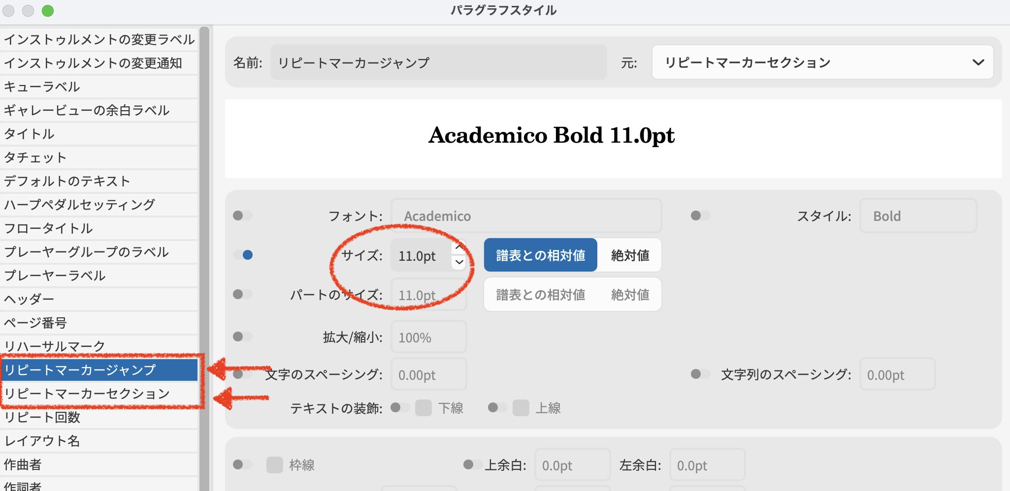 ❶ ジャンプ記号のテキスト(D.C. や D.S. など)のサイズを調整するには、