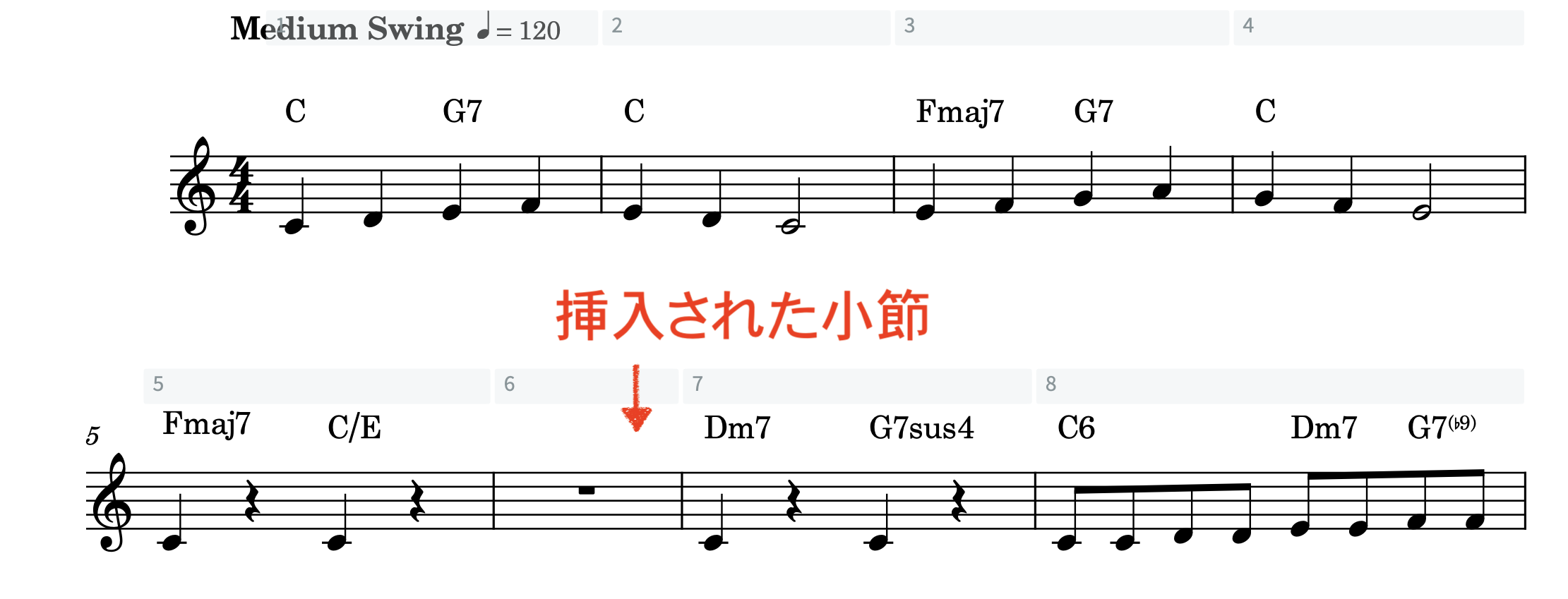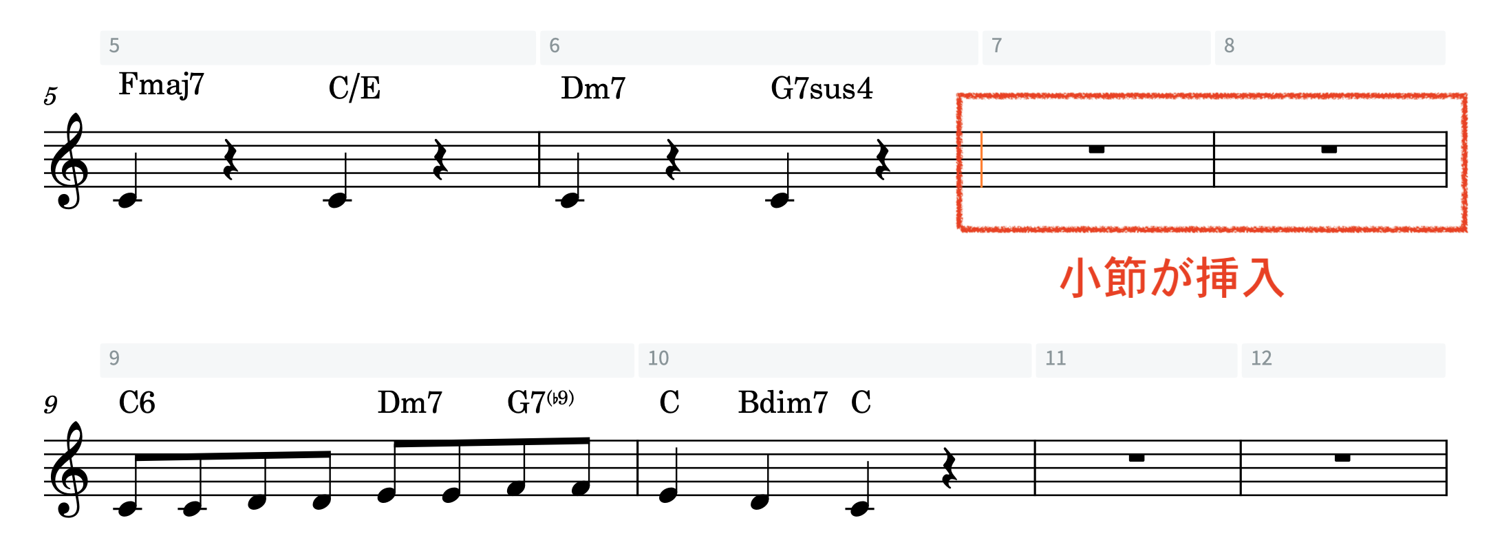 このように、5小節目と6小節目の間に小節が挿入されました↓