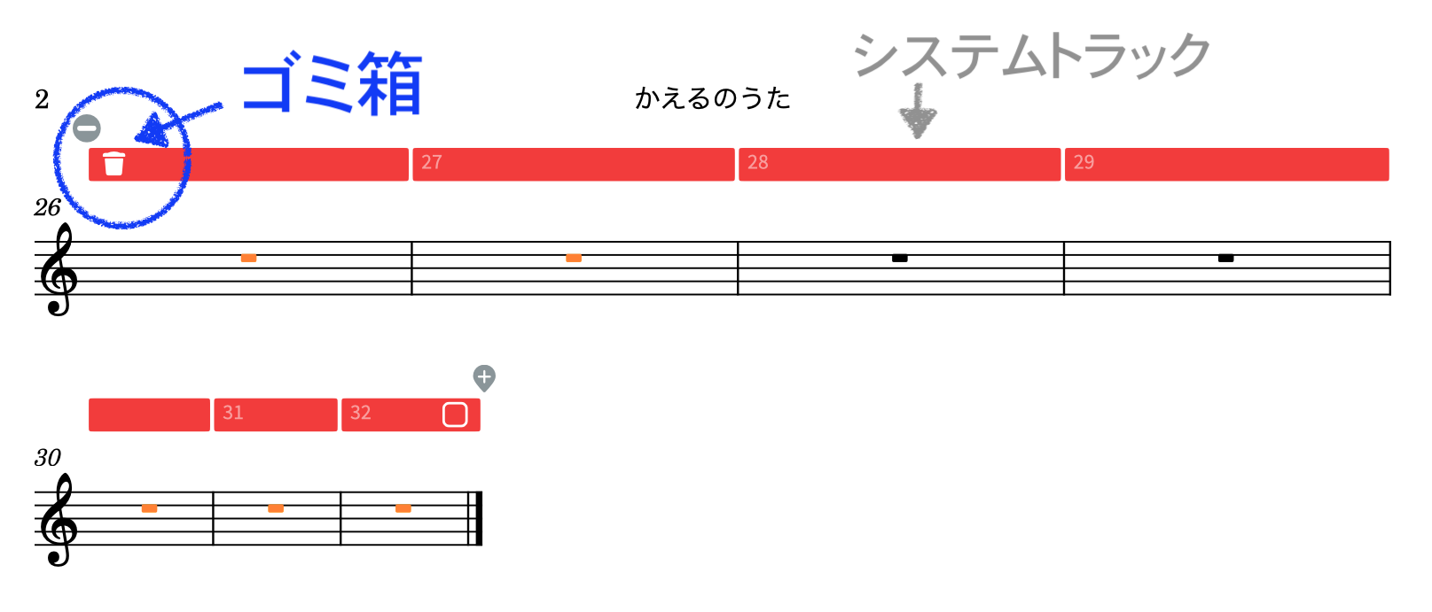 削除したい小節のシステムトラックを選択して、ゴミ箱のマークをクリックします。(システムトラックは、小節の上に表示されている薄いグレーのバーのことです。)