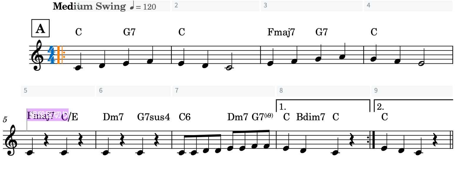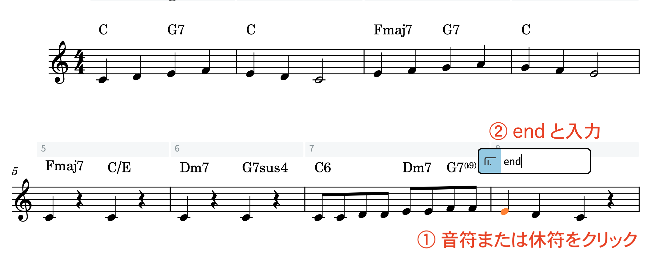 ☝? 複数小節に1番括弧を入力したい場合は、1番括弧を入力したい始めの小節と最後の小節の音符また休符を選択すればOKです!