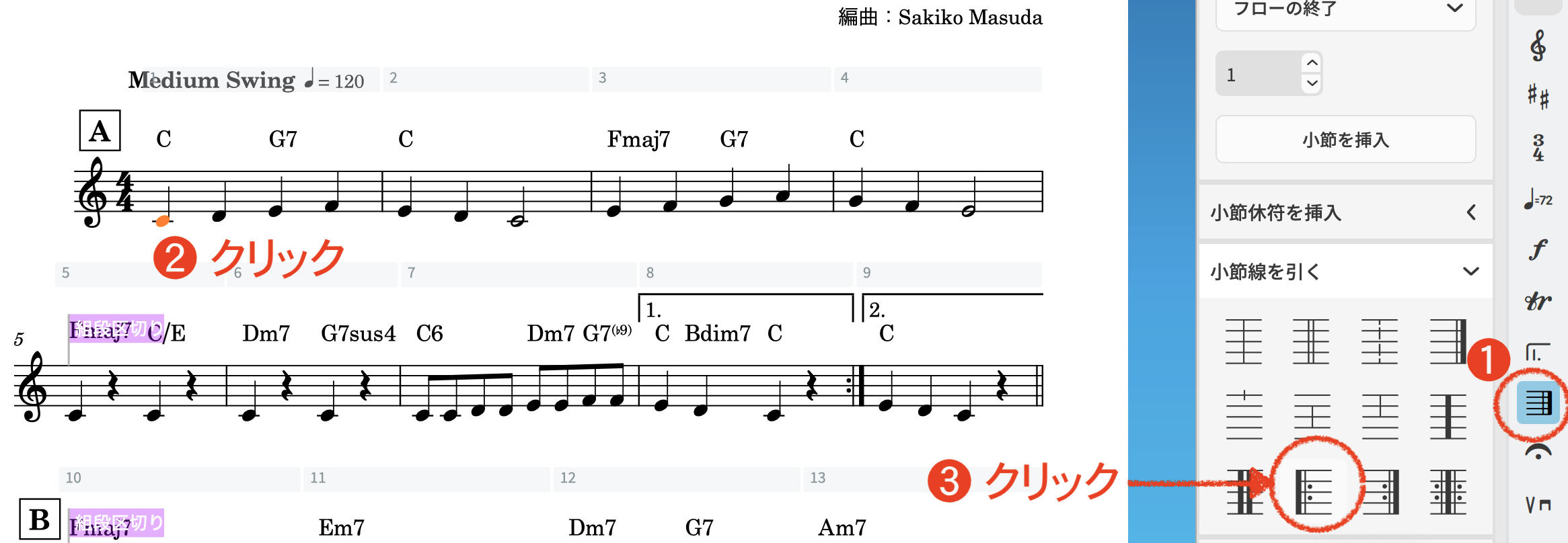 ② ダブルバーにしたい小節線を選択します。(*画像は ❸ を押した後のものです。)