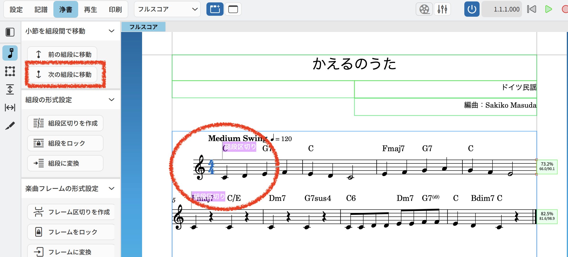 選択した小節が、次の組段に移動します。今回は1段目を2段目(下の組段)に移動させたいので『次の組段に移動』を選択します。