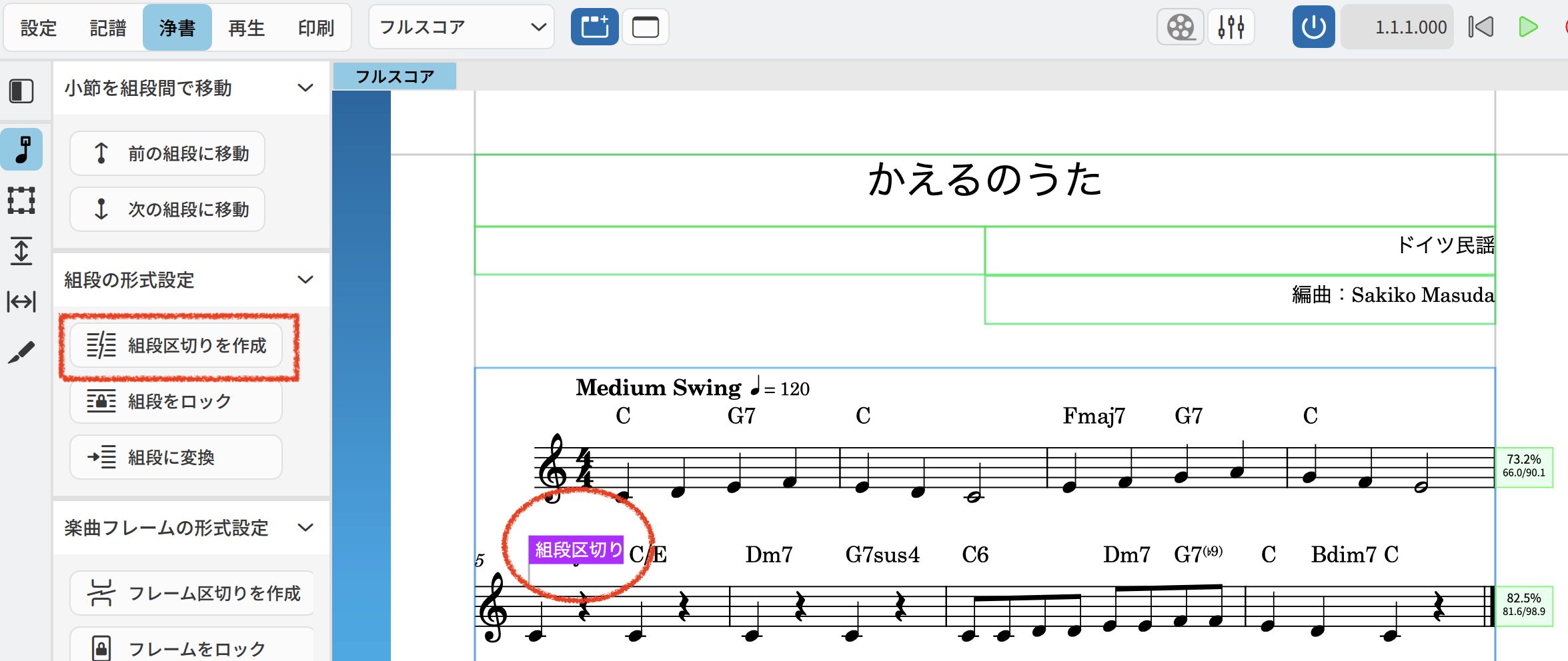 組段区切りの作成は、組段区切りを作りたい小節を選んで、