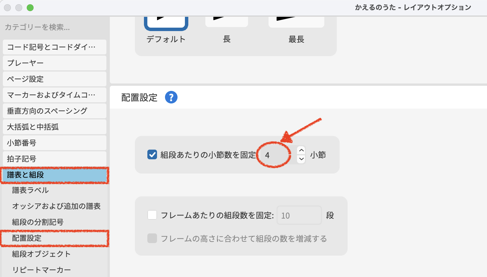組段の小節数を固定する方法は、レイアウトオプションの『譜表と組段』の配置設定で行います。