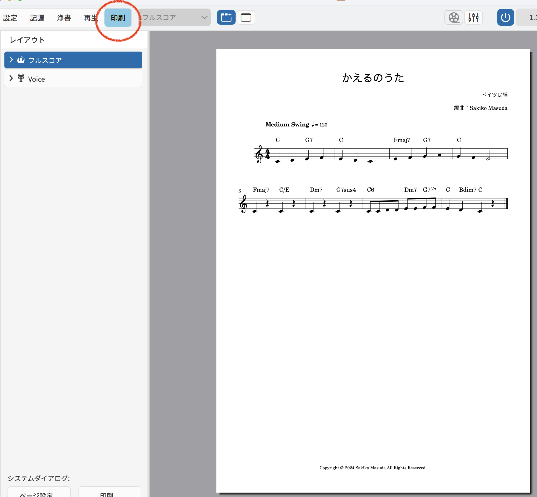 小節数の調整ができたところで、印刷モードで楽譜を確認してみましょう!