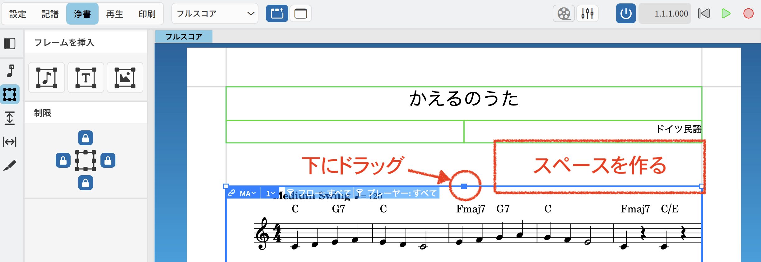 ② 作曲者(ドイツ民謡)の下に表示させたいので、楽譜部分の青い枠を下にドラッグしてスペースを作ります。