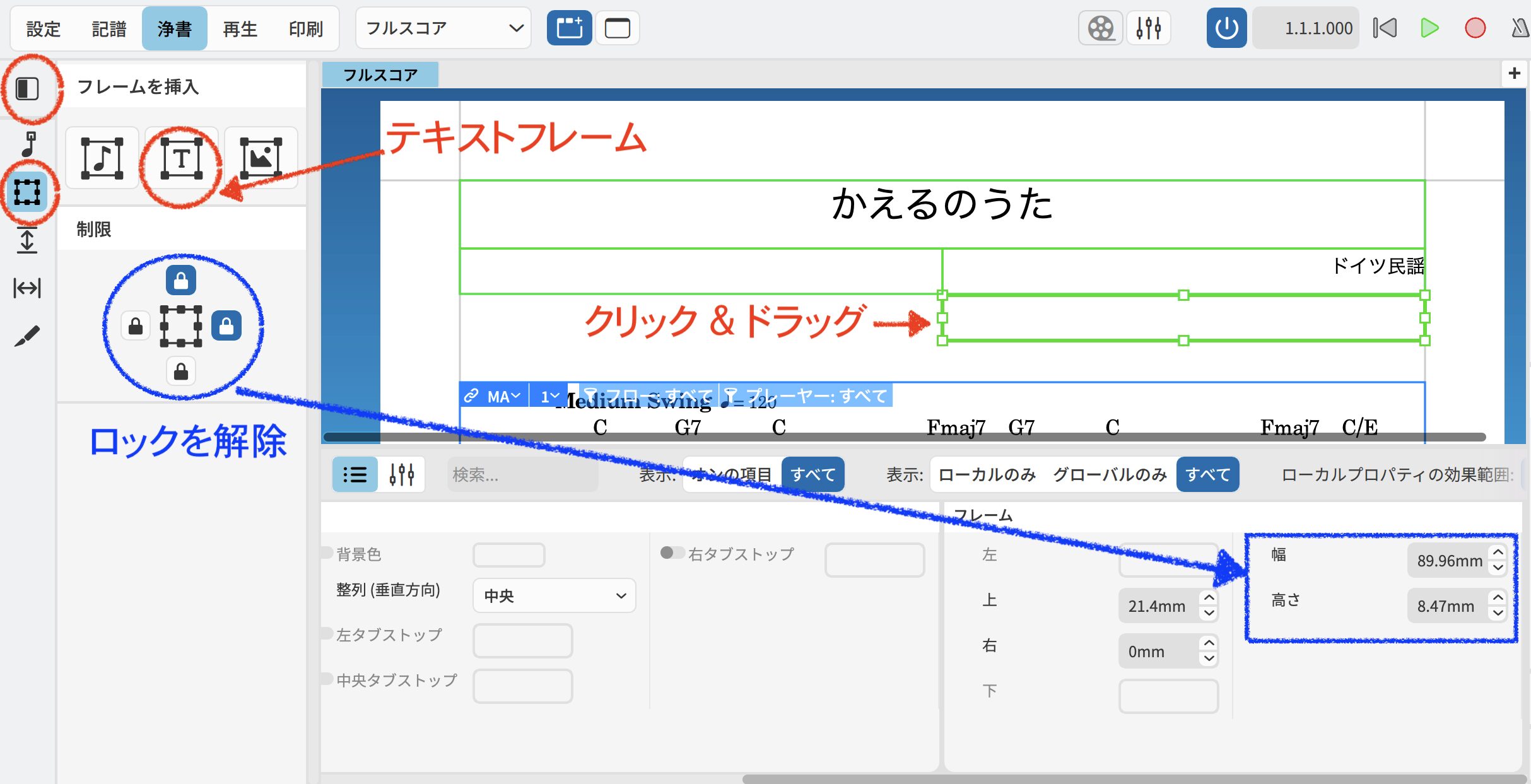 もし必要な情報が楽譜上に表記されない場合は、浄書モードでテキストフレームを作成し、フレームにテキストトークンを入力すると表示できます。