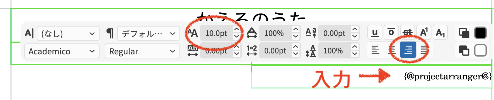 ④ テキストフレーム内をダブルクリックして、編曲者を表示するトークンを入力します。プロジェクトページの編曲者は{@projectarranger@}と入力します。