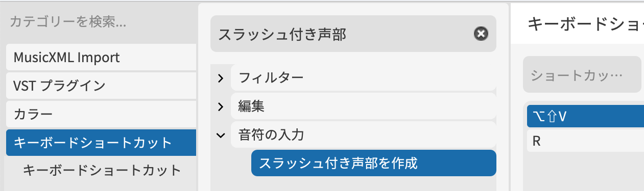 私はスラーよりスラッシュをよく使うので、S をショートカットを割り当てました。(スラーのショートカットキーの割り当てがなくなります。)