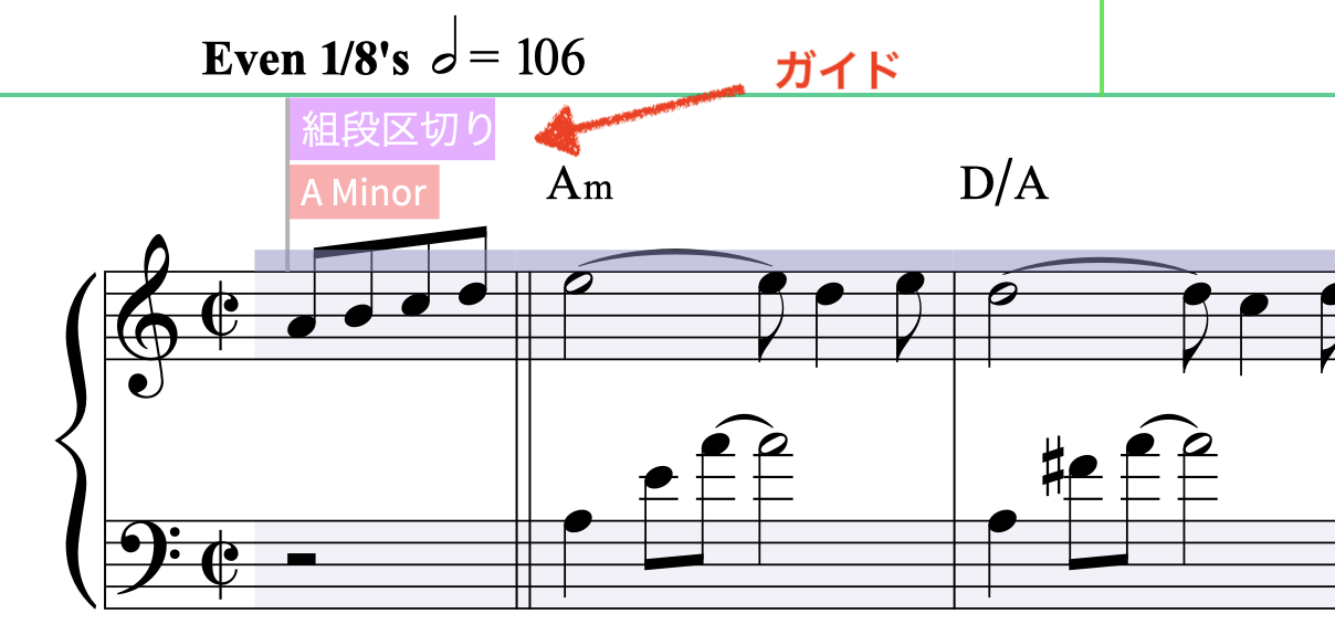 浄書作業では、「組段区切り」などをどこに入れたかを確認するためにガイドの表示がとても役立ちます。