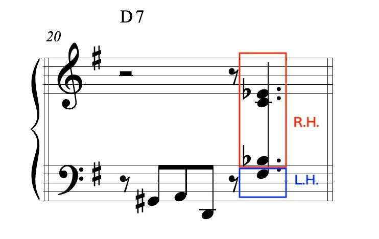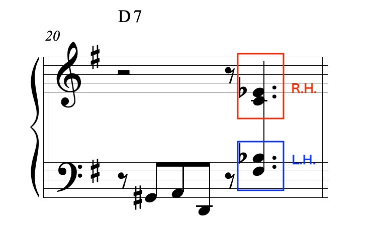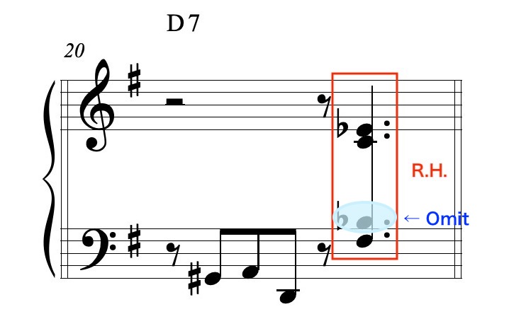 ① 4和音として右手で弾く。① Play with the right hand.