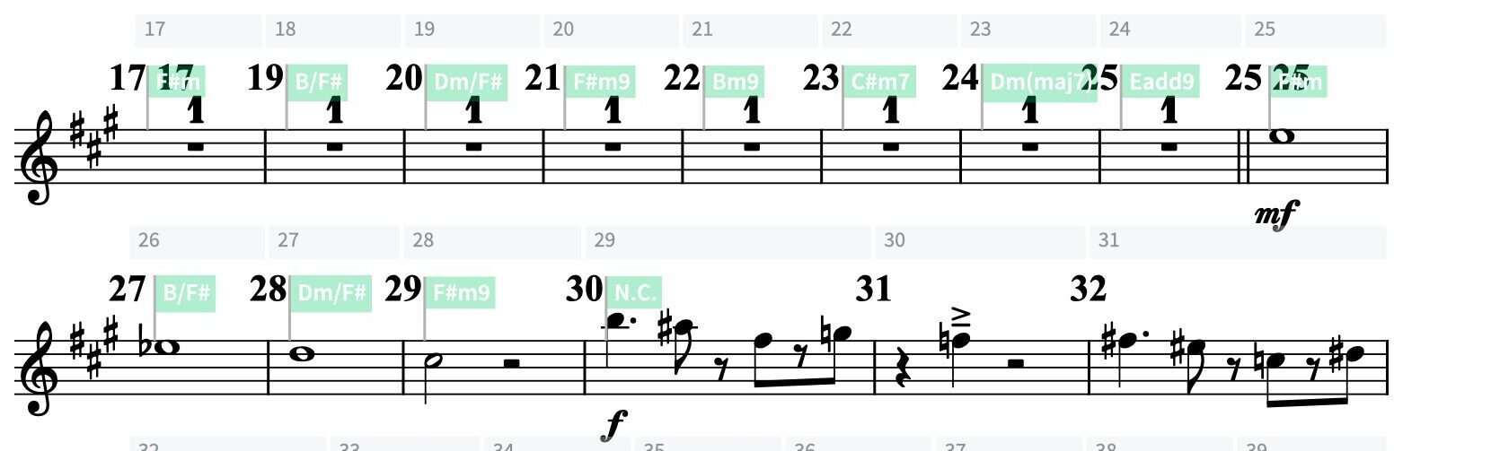 あと、1段におさまる小節数や1ページにおさまる組段は自動で変更されていました。重なりなどの不具合はなく、1段や1ページに綺麗におさまるような設定になっているようです。