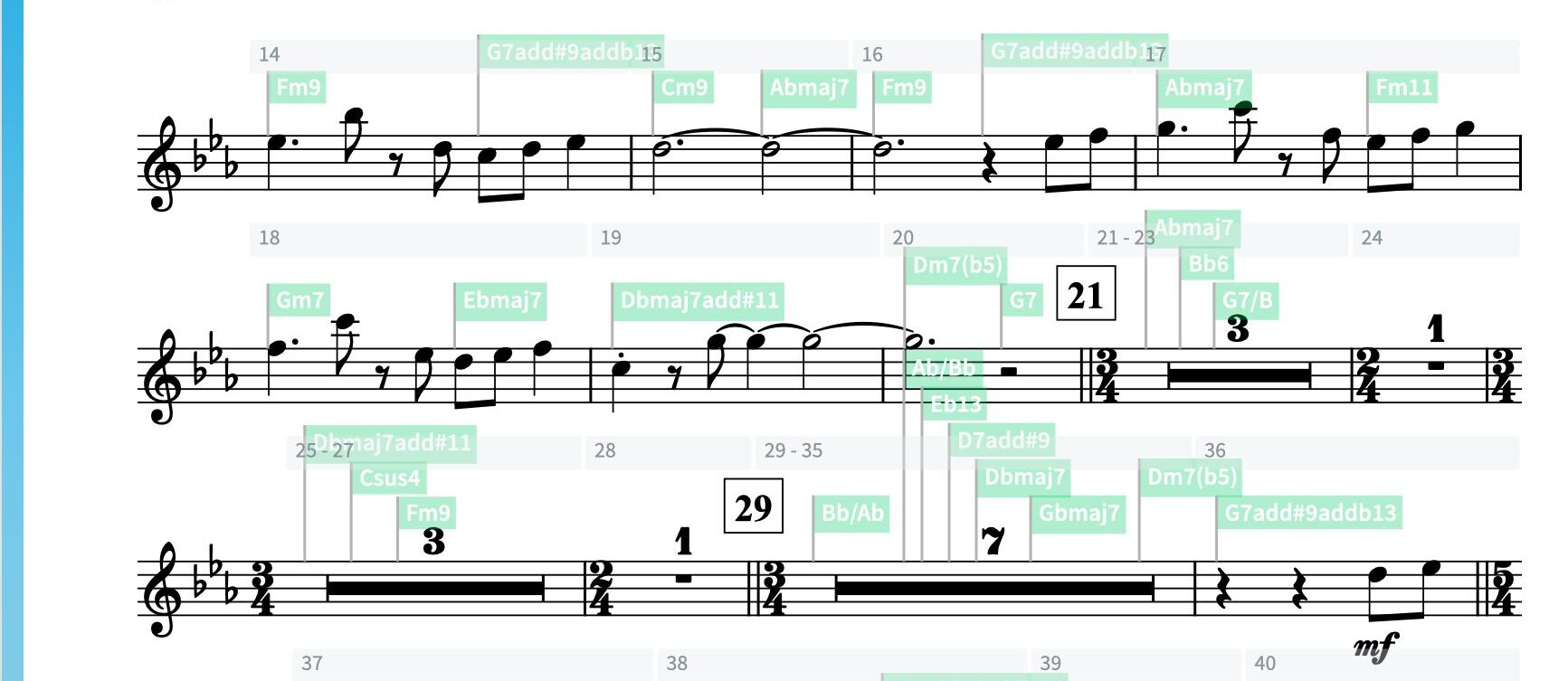 ③ コード・ネームは、テンション表記"add" が付いています。例:E♭mja7(#11)が E♭mja7(add#11)、C7(♭9)は C7(add♭9)というかんじです。これは設定でどうにかなるのかな?